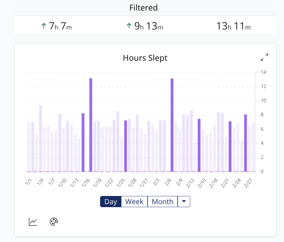Let's take a look at days where I slept zero hours the day before, and we can go and see the matching logs: