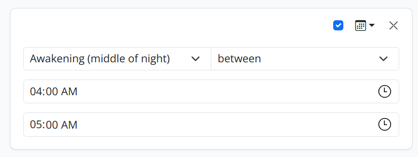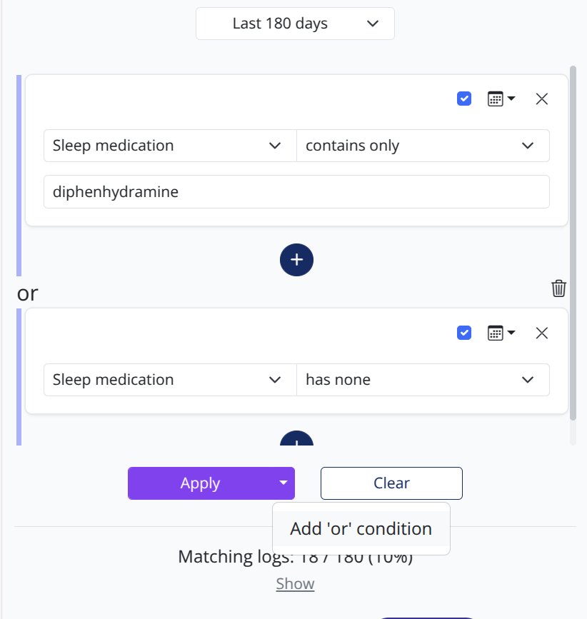 It's been quite limiting that you could only search your sleep logs by filtering for A and B and C... No more! You can add filters to find sleep logs that match criteria A or B, and even more complex filters like (A and B) or (C and D).