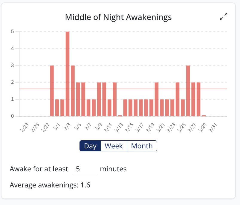 Middle of the night awakenings disturb how restful you feel in the day, so I'm hoping this chart will help people (including myself!) track down days where they have unexpectedly high number of awakenings.